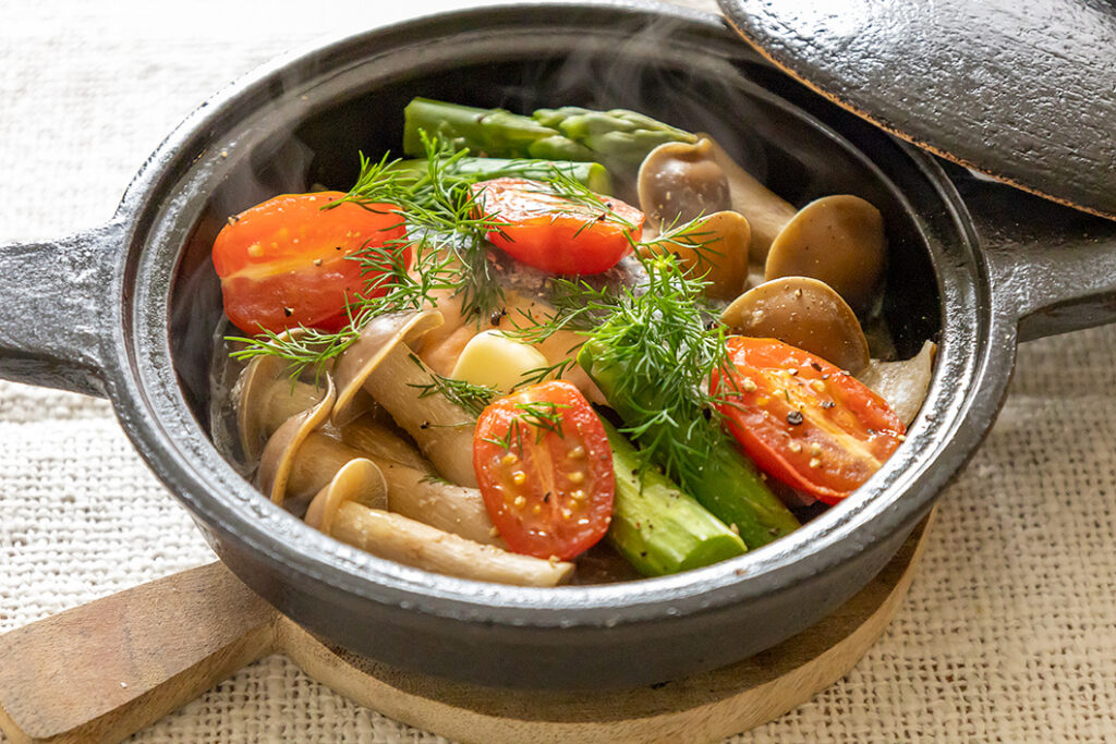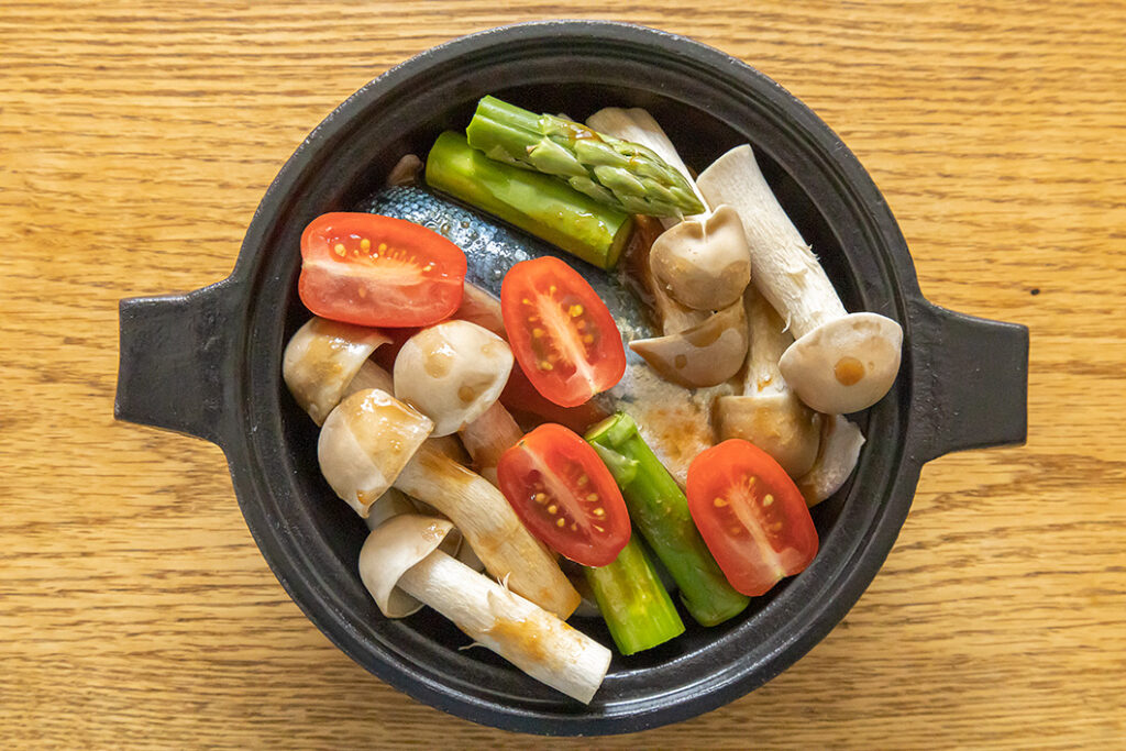 ホイル焼き風の蒸し焼き料理です。小さい土鍋の「キャセロールマイン」なら、一人分の材料を入れて火にかけるだけで完成! できたてアツアツをそのまま食卓へどうぞ。