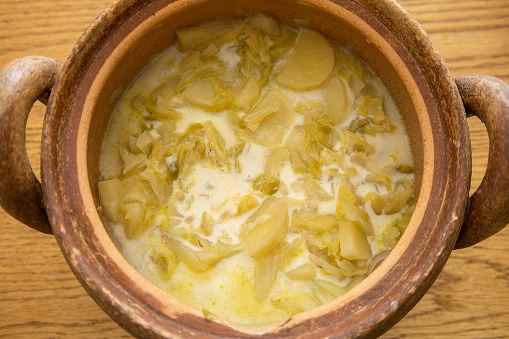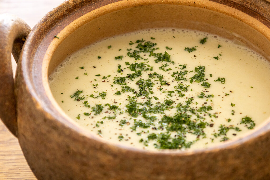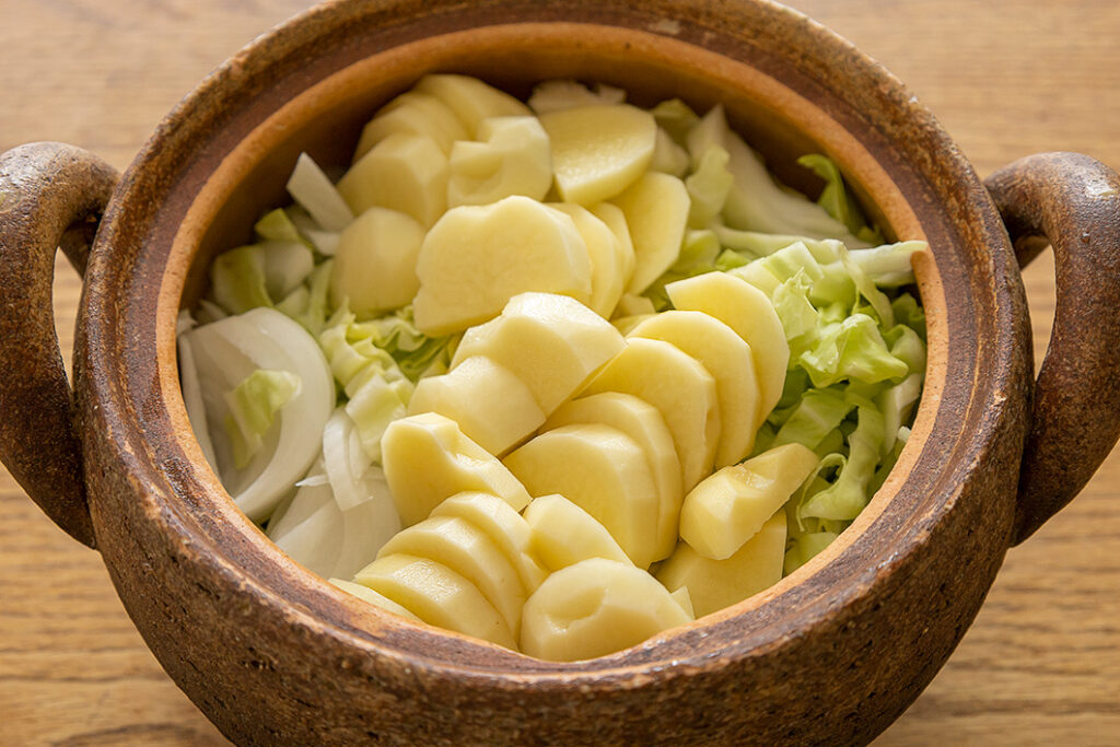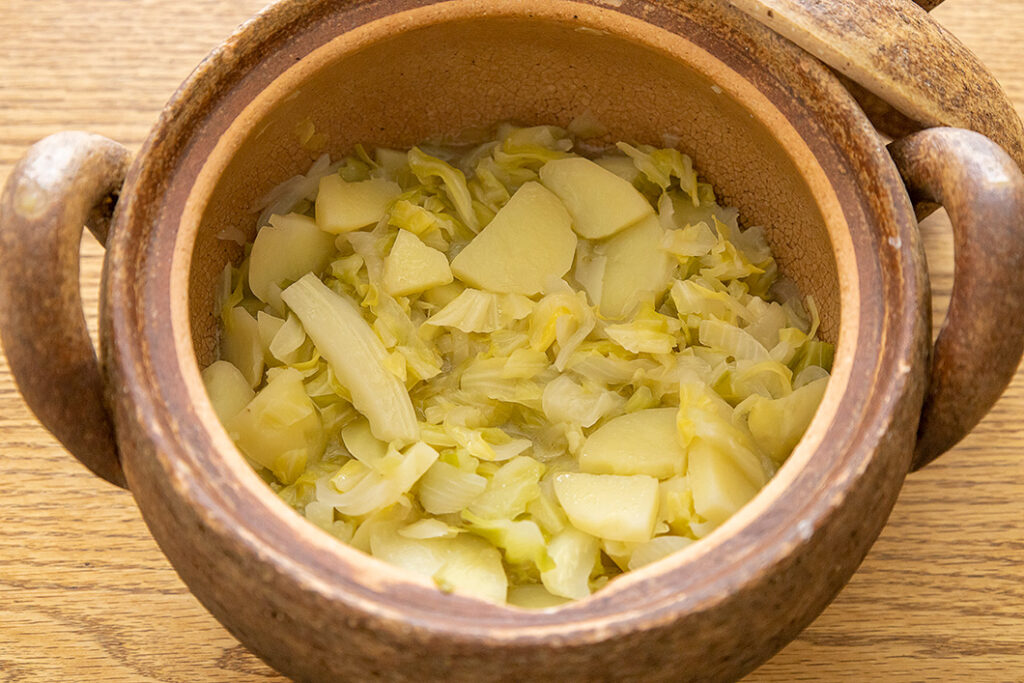 キャベツやじゃがいもなどお好みの野菜を土鍋いっぱいに入れ、無水で柔らかく煮込んで冷たく仕上げるポタージュスープにします。