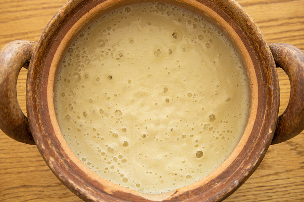 (3)に牛乳を200mL加え、ハンドブレンダーを土鍋に差し込んで撹拌し、なめらかにする。