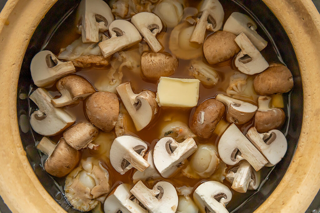 大きいホタテを使う場合は、マッシュルームの大きさに合わせて切ってください。