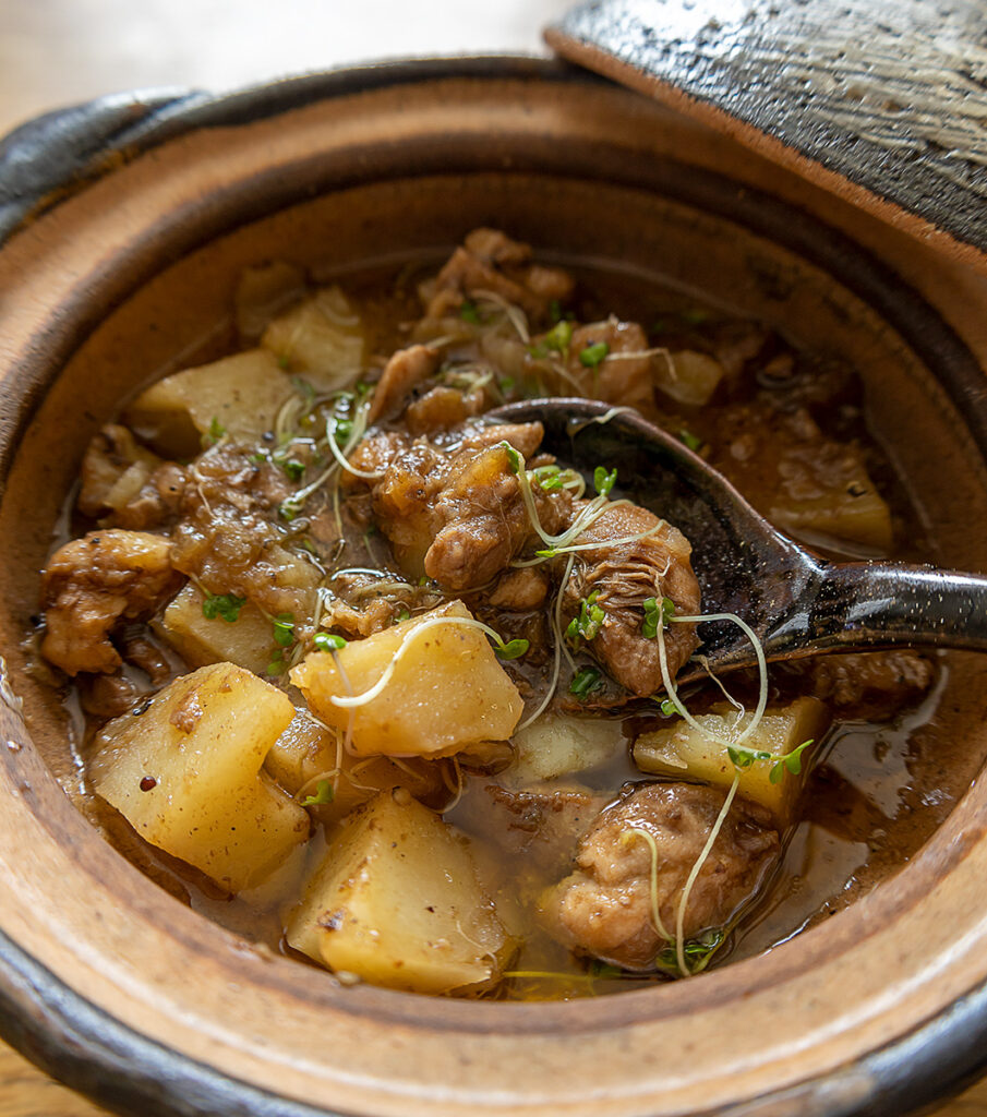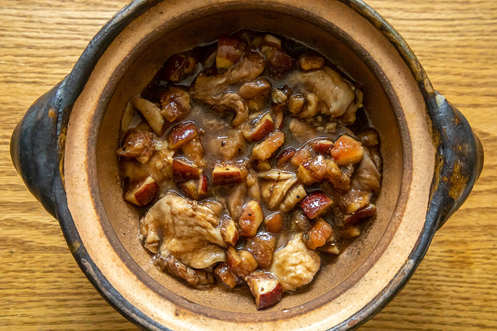 小さい土鍋はちょっとした煮物の一品を作るのにとても重宝します。季節の果物と酢、鶏肉を組み合わせた小さな煮込み料理は、少し涼しくなってきたら作りたい秋の土鍋おつまみです。ワインのお供にどうぞ。