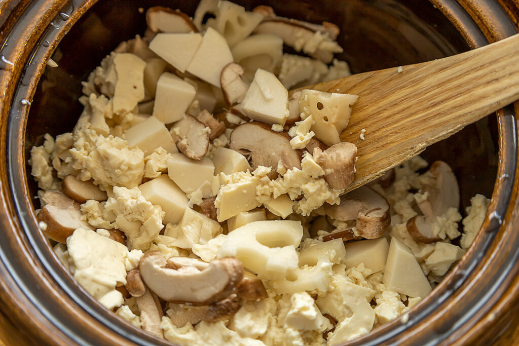 一度沸騰したら、あとはほとんど煮込みません。大きな土鍋の蓄熱力で、根菜も柔らかく仕上がります。いろいろな食材を組み合わせて、季節ごとの土鍋豚汁をお楽しみください。