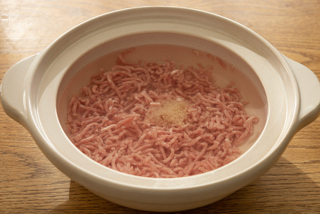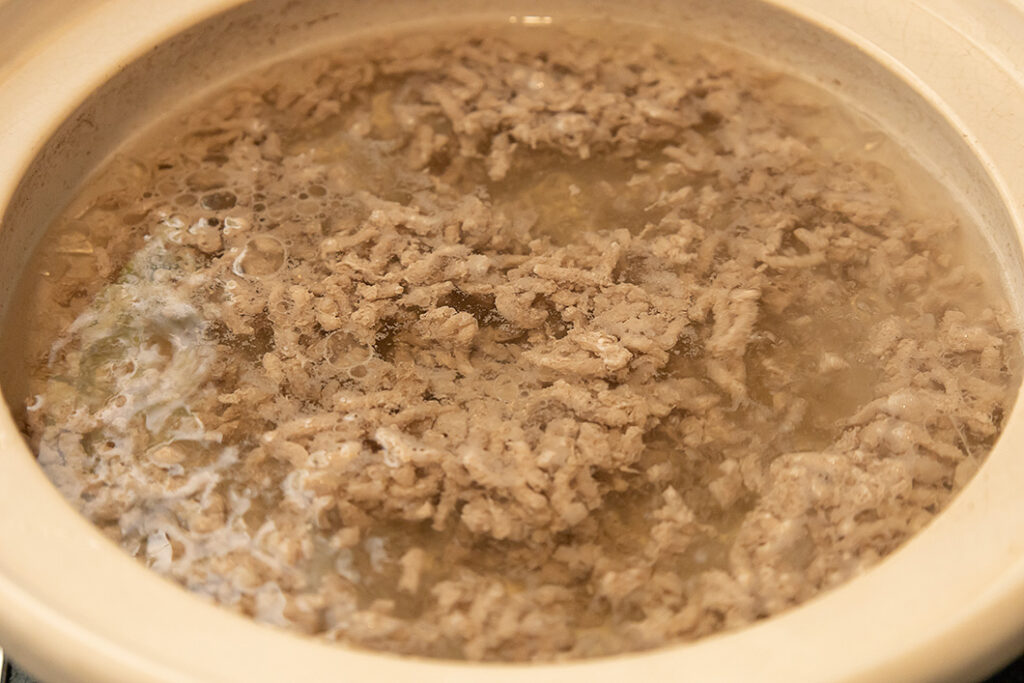 [A]を土鍋に入れ、ミンチがほぐれるまで混ぜる。ふたをして中火にかけ、沸騰したらふたを取り、軽い沸騰が続く程度の火加減で10分煮込む。アクが出てくるのでこまめに除く。火を止め、しょうゆ・塩を加えて混ぜ、ふたをして10分ほどおく。