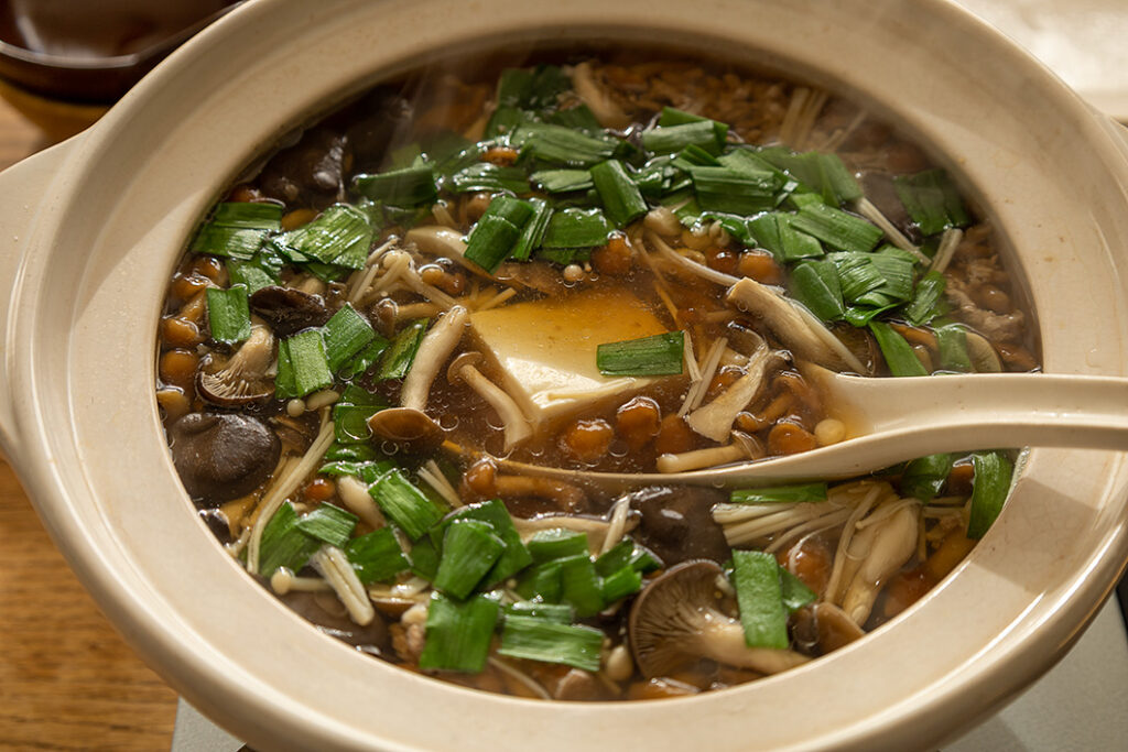 (1)にきのこ・豆腐を加えて中火にかけて煮る。仕上げにニラを加える。お好みで七味など薬味をかけていただく。