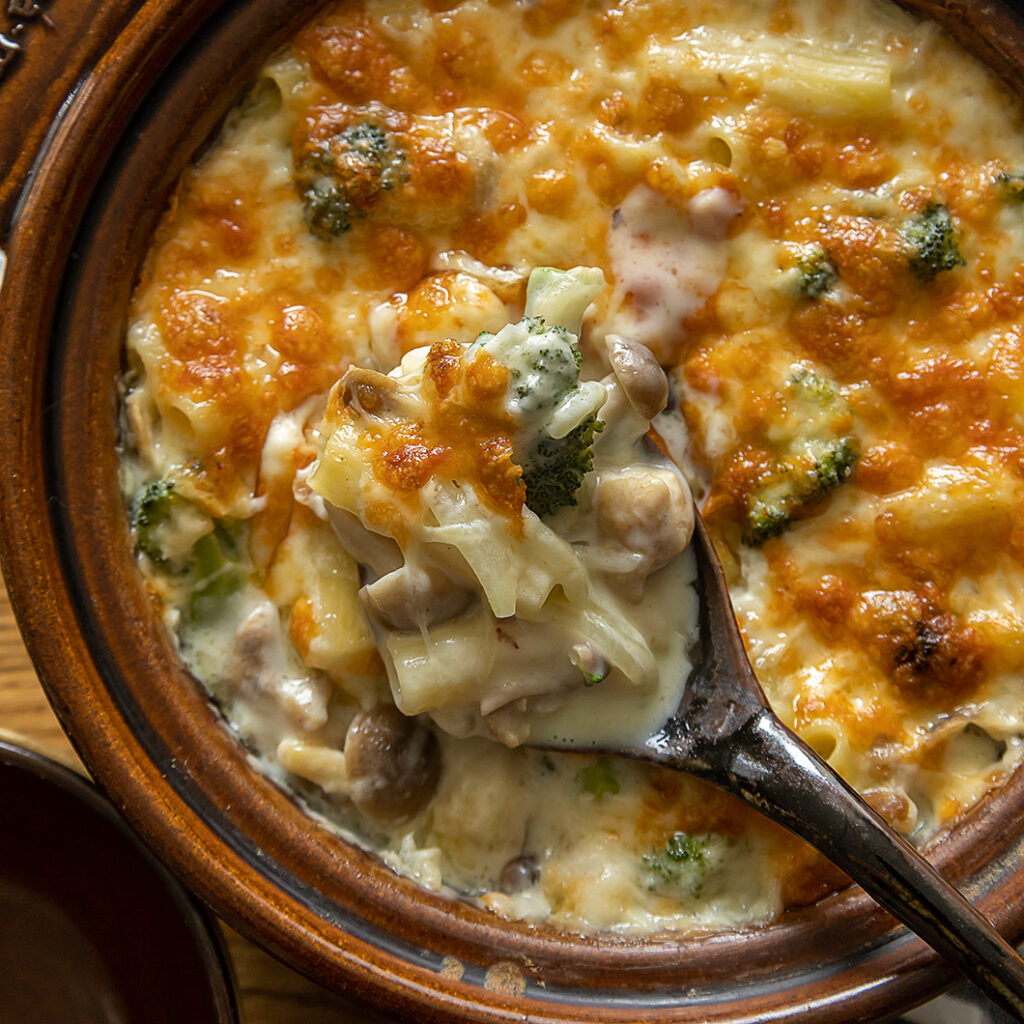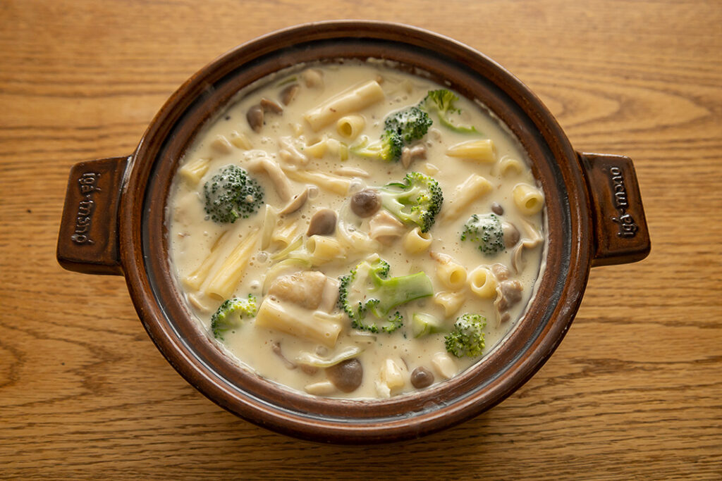 土鍋ひとつでできるマカロニグラタンレシピです。炒め〜煮込み〜オーブン調理まで、ビストロ土鍋があればOK! たっぷり&アツアツのグラタンを家族や友人とお楽しみください。