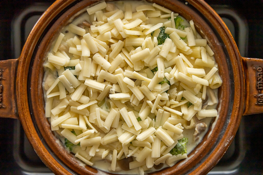 オーブンを230℃に予熱し(その間に土鍋は余熱調理)、オーブンが温まったら全体にチーズをかけて、こんがり焼き目がつくまで約8分焼く。