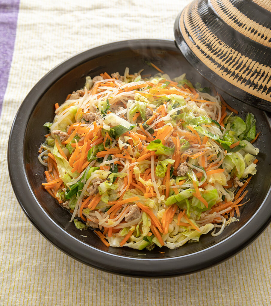 焦げそうな場合は火を止めて、余熱で仕上げてください。タジン鍋のように食材の水分で蒸し焼きにします。大皿料理として、できたてアツアツを土鍋ごと食卓へ運んでお楽しみください。