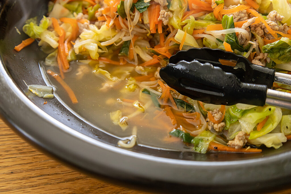 中火にして【A】を加えてさっと混ぜ合わせ、肉の上にもやし・にんじん・キャベツ・ニラを順に高く盛るようにのせていく。