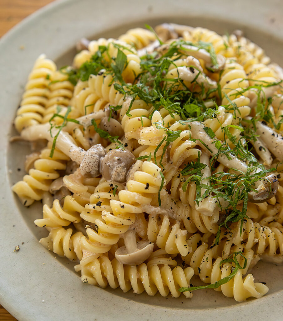 蒸し鍋の二段活用レシピ。土鍋でパスタをゆでつつ、陶製すのこの上で具材とソースを加熱します。今回はマカロニとしめじで、たらこクリームパスタを作りました。とても美味しくできるので、ぜひお試しください。