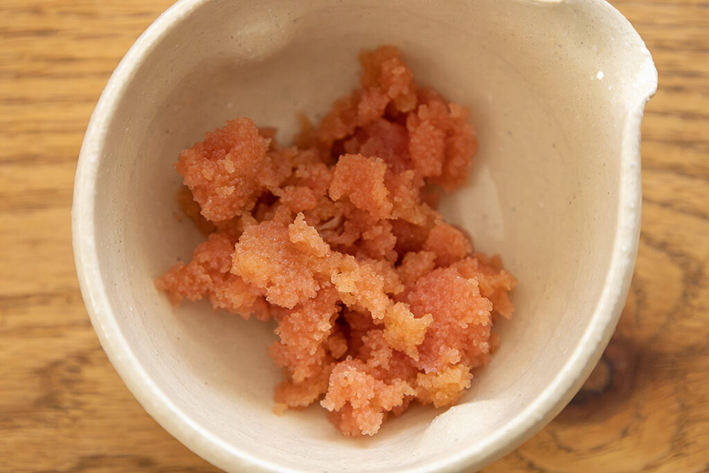 しめじは根本を切り落とし、バラバラにしておく。たらこは薄皮に切り込みを入れて中身をこそげ出す。