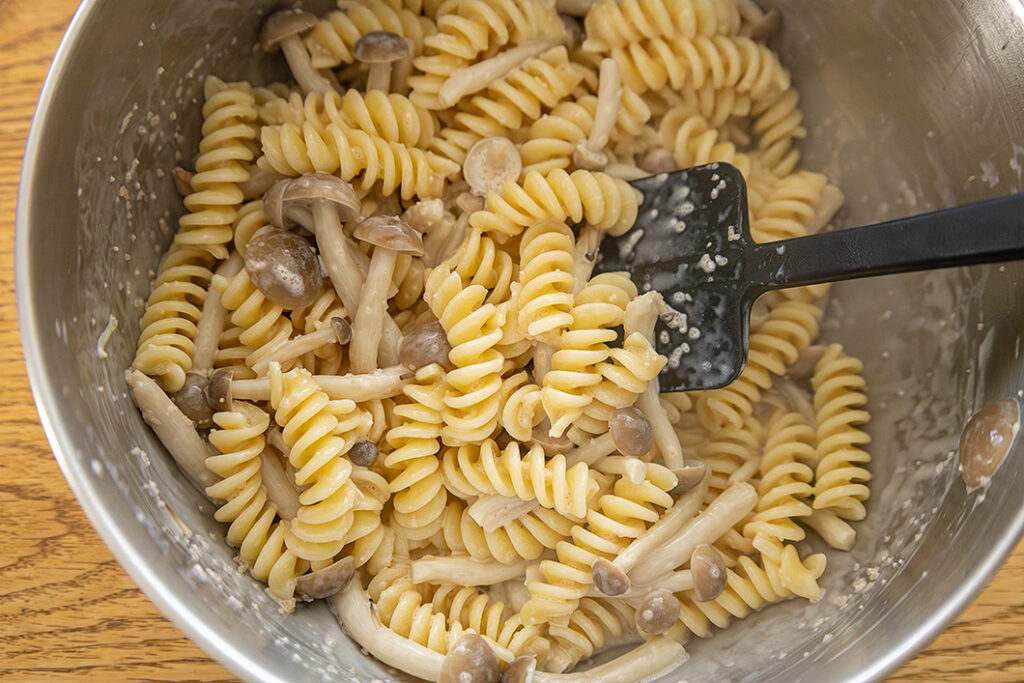 作業時間を考慮して、ゆで時間は袋の表示より1分短くしています。マカロニはメーカーや種類によってゆで時間が異なります。6分以上のものを選び、しめじとソースを加えてからの加熱時間が4分以上とれるようにしてください。例えば、9分の場合はパスタのみ3分・きのことソースを加えて4分・余熱調理1分というふうに調整してください。