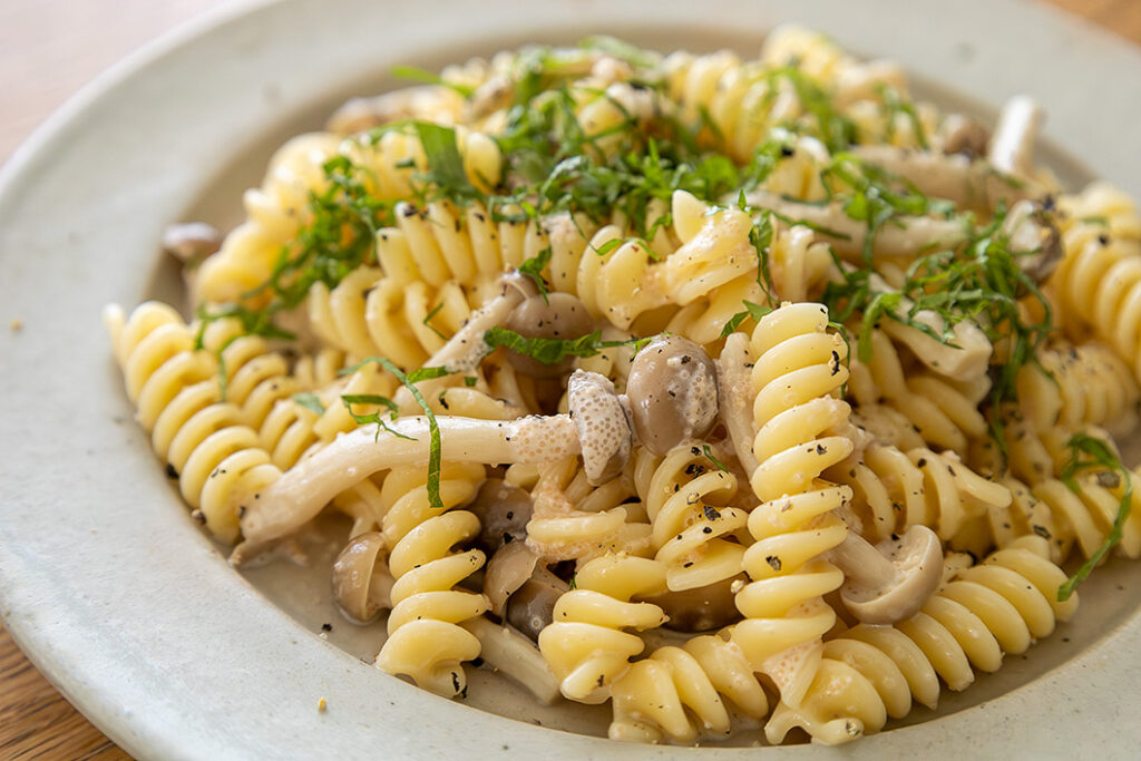 しめじのボウルにマカロニを加え、ソースをかけてよく和える。器に盛り付け、大葉をのせ、黒こしょうをふる。