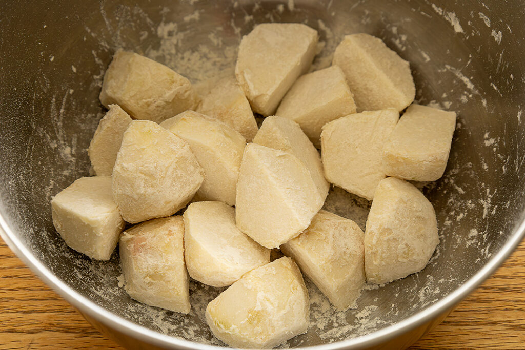 里いもに小麦粉をまぶすときは、大きめのボウルに里いもと小麦粉を入れ、ボウルを振るようにすると簡単です。マカロニやレンコンを入れても美味しいです。