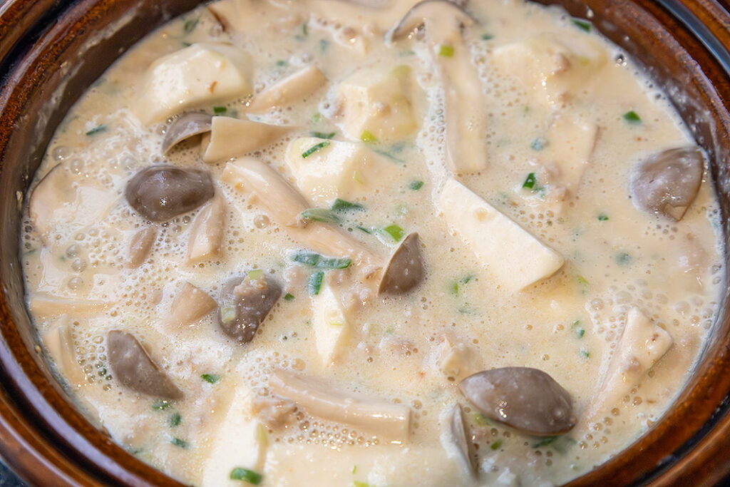 (2)に里いもを加えて(小麦粉も入れる)軽く混ぜ、牛乳を加える。沸騰したらしめじを加えて軽く混ぜ、弱火で5分煮込む(焦げ付かないようにときどき混ぜる)。火を止めてふたをし、10分余熱調理する。味見をして、必要な場合は塩を加えて味をととのえる。