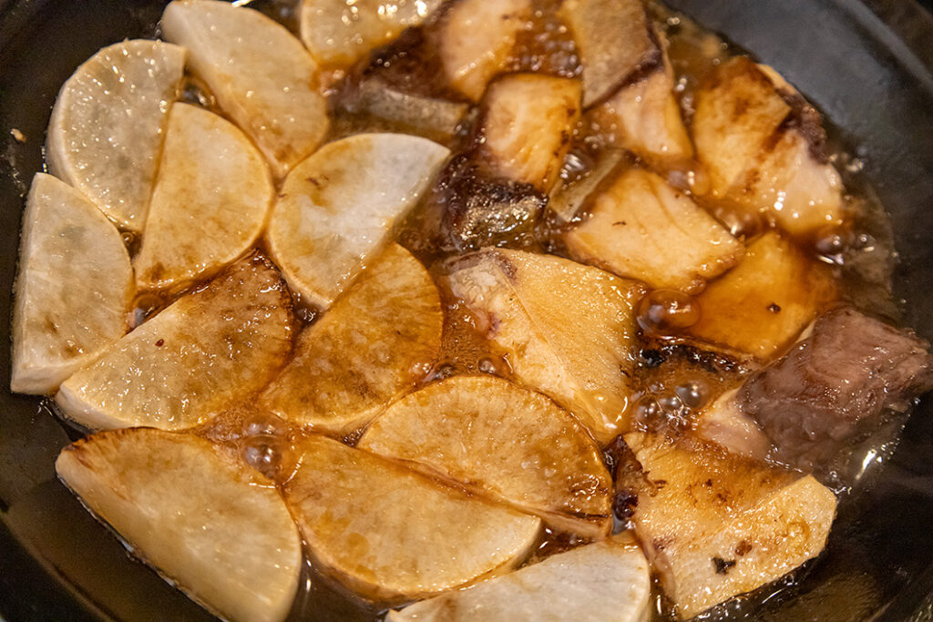 ※加熱中にふたをしない理由は、大根から水分が出て、油が跳ねるため。