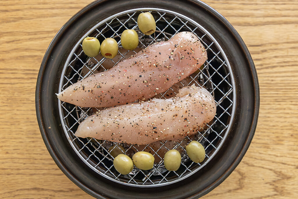 ※今回はグリーンオリーブの種を除いて唐辛子ペーストを詰めた加工品を使いました。