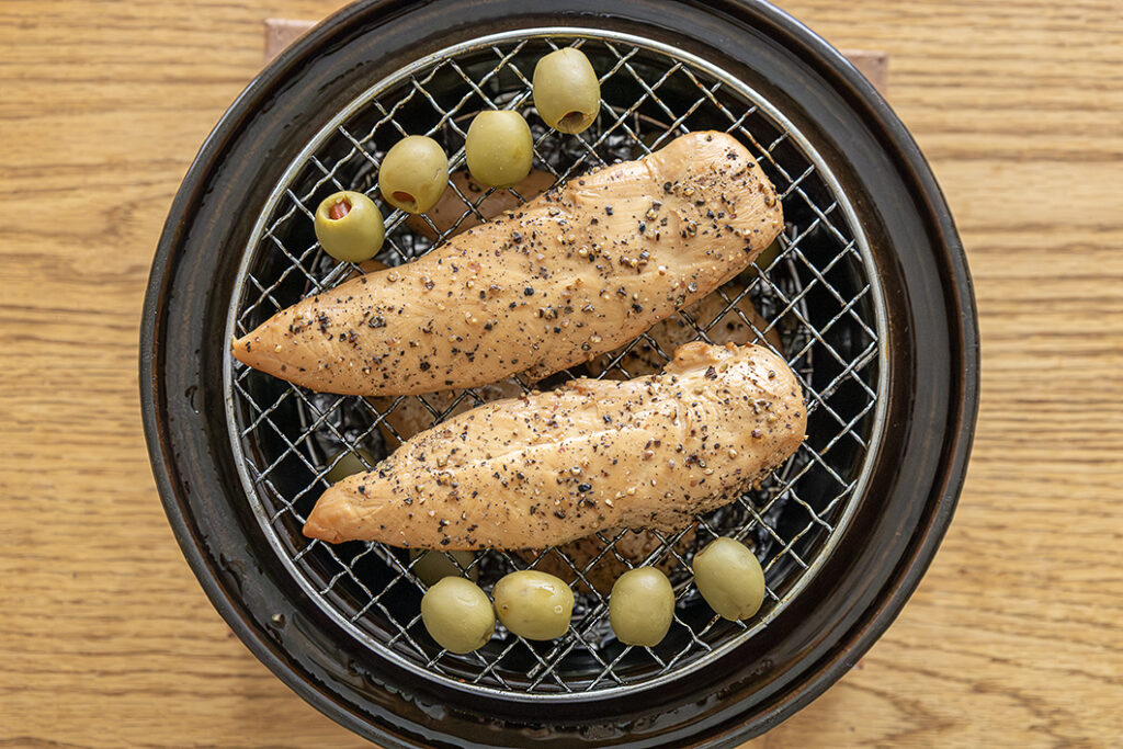 コンロに「いぶしぎん」を水平にセットし、ふたをしないで強火にかける。約4~5分加熱し、煙が出てきたらふたをする。ふたのへりから煙が出てきたら「いぶしぎん」の溝に水を注ぎ、さらに5分加熱する。火を止めてそのまま20分余熱調理する。