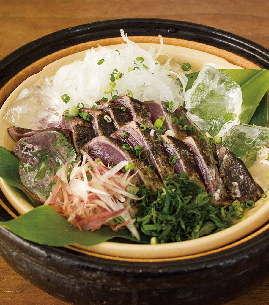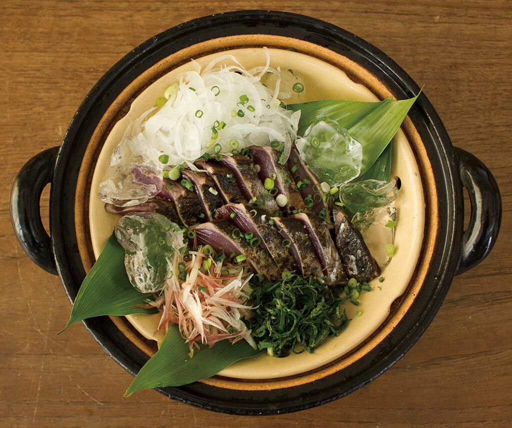陶製すのこにハランなどを敷き、鰹・野菜・薬味をバランスよくのせる(氷も少し添えると涼しげです)。ふたをする場合は、ふたにも水を含ませる。