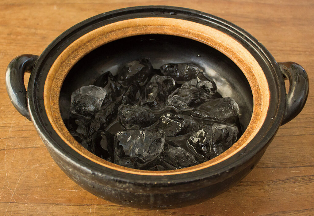 土鍋全体を水にくぐらせ、水気を拭く。土鍋の半分ぐらいまでの氷・少量の水を入れ、「陶製すのこ」をセットする。