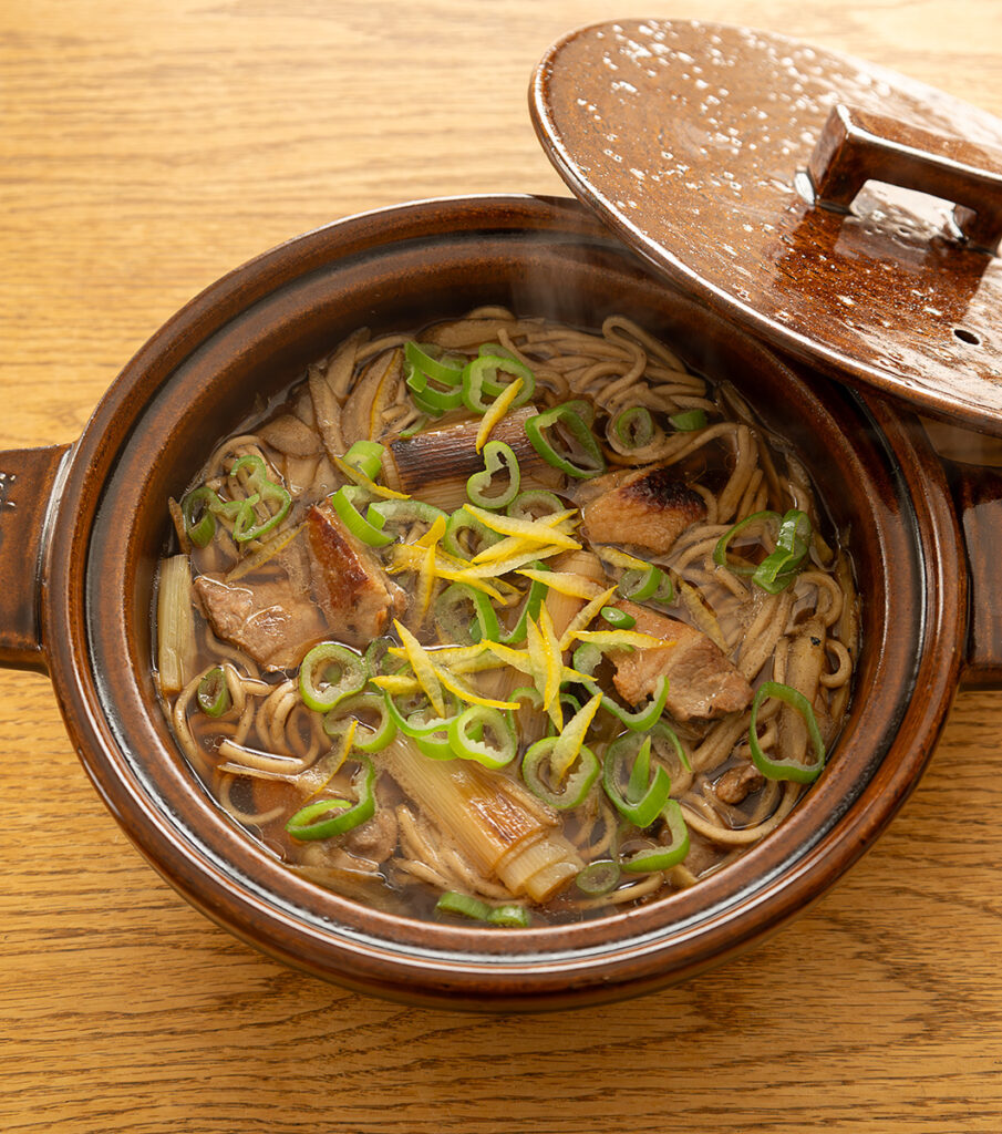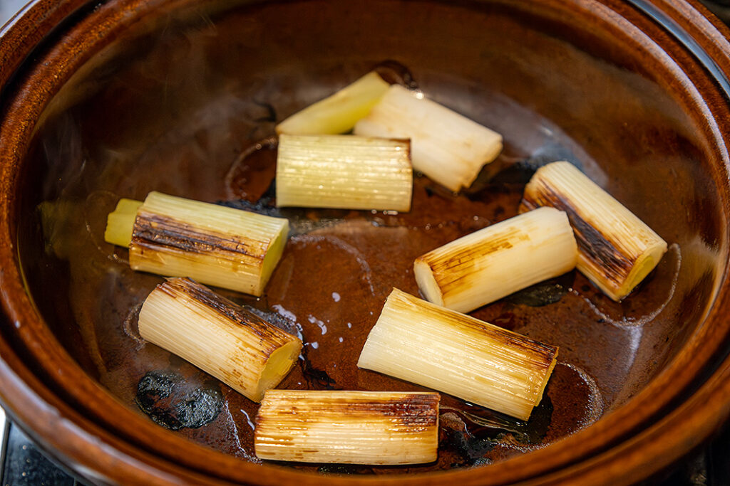 空焚き可能で手頃な大きさの「ビストロ土鍋」で、美味しい鴨そばを作りました。ねぎや鴨肉を焼きつけたり、ごぼうをじっくり炒めたり、そのまま煮込みまで土鍋一つでできるメニューです。