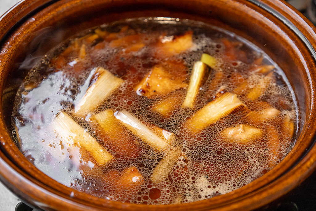 空になった「ビストロ土鍋」にごぼう・砂糖を入れ、じっくり炒める。ごぼうがしんなりしたら【A】を加え、沸騰したら鴨・長ねぎを戻し入れて弱火(軽い沸騰が続く程度の火力)にして5分煮込む。