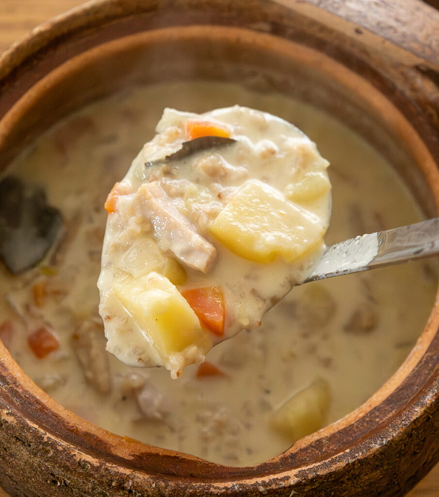 空焚き可能で煮込みが得意な「みそ汁鍋」で、玄米入りの具だくさんスープを作りました。寒い季節にぴったりです。