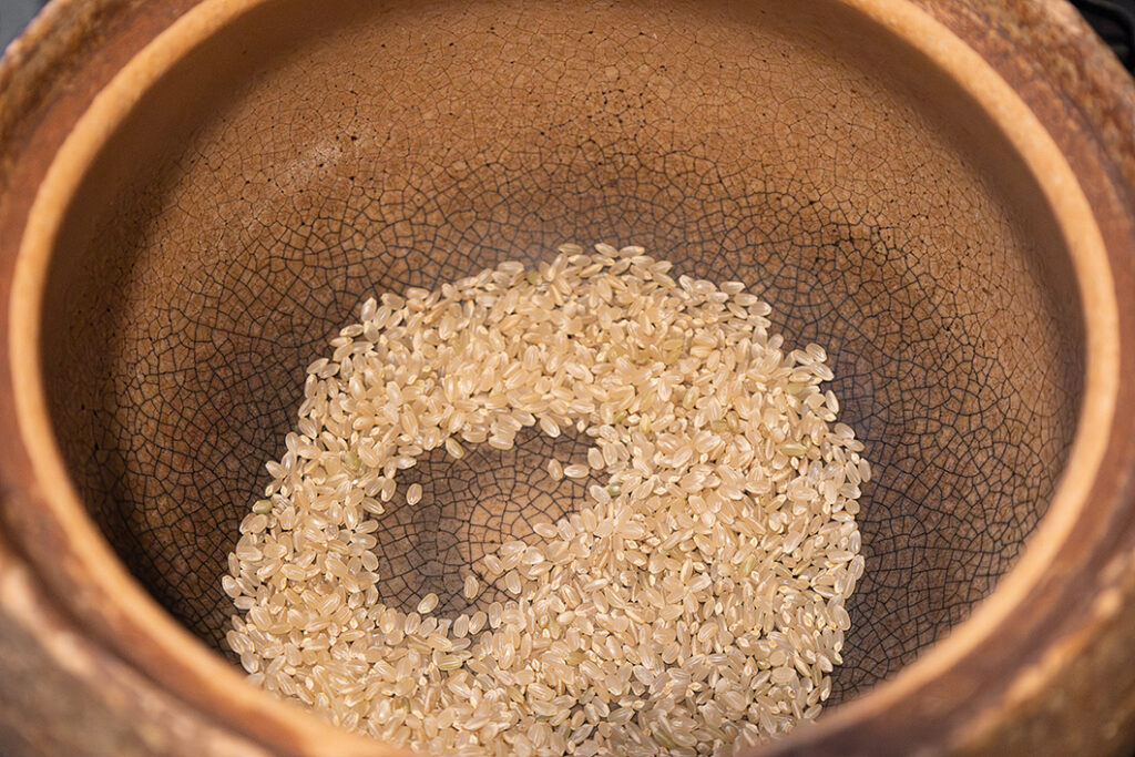 土鍋に玄米を入れ、中火にかける。2〜3分後、土鍋が温まってきたら弱火にして絶えず混ぜながら炒め、プチプチと弾けてきたら火を止める。さらに余熱で炒め、全体的に玄米の透明感がなくなったらいったん皿などに取り出す。