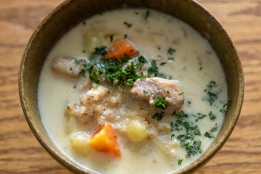 玄米は炒ることで米表面のロウ層が割れ、熱が入りやすく・栄養素が出やすくなります。今回は肉や生クリームで旨みたっぷりのスープにしましたが、お吸い物仕立てやトマト仕立ても美味です。空焚きできて、余熱調理が得意な「みそ汁鍋」で、いろいろな玄米スープをお楽しみください。