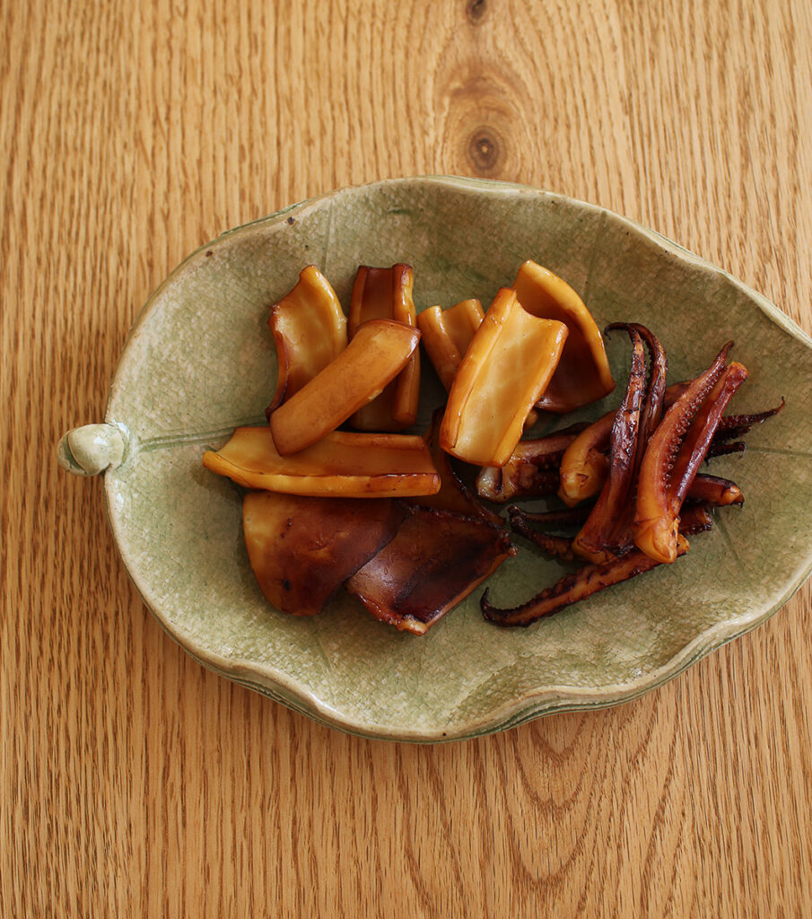 スルメイカは胴に指を入れて丁寧に内臓を取り出す。軟骨を引き抜き、中を洗ってえんぺらを外し、皮をむく。足は目の下で切り離し、くちばしを除く。胴も足も食べやすく切り、全体に塩をふって約5分おき、水気を拭く。