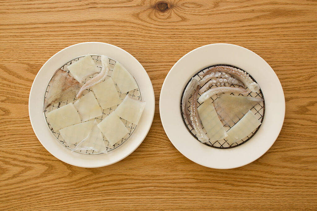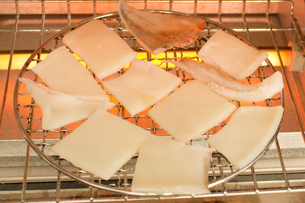 (1)のイカを上下の網に重ならないように並べ、網ごとオーブントースターに入れて低温で5分ほど下焼きする。トースターから取り出したらそのまま10分ほどおき、冷ます。イカの表面に浮いた水分を拭き取り、もう一度上から塩をふる。
