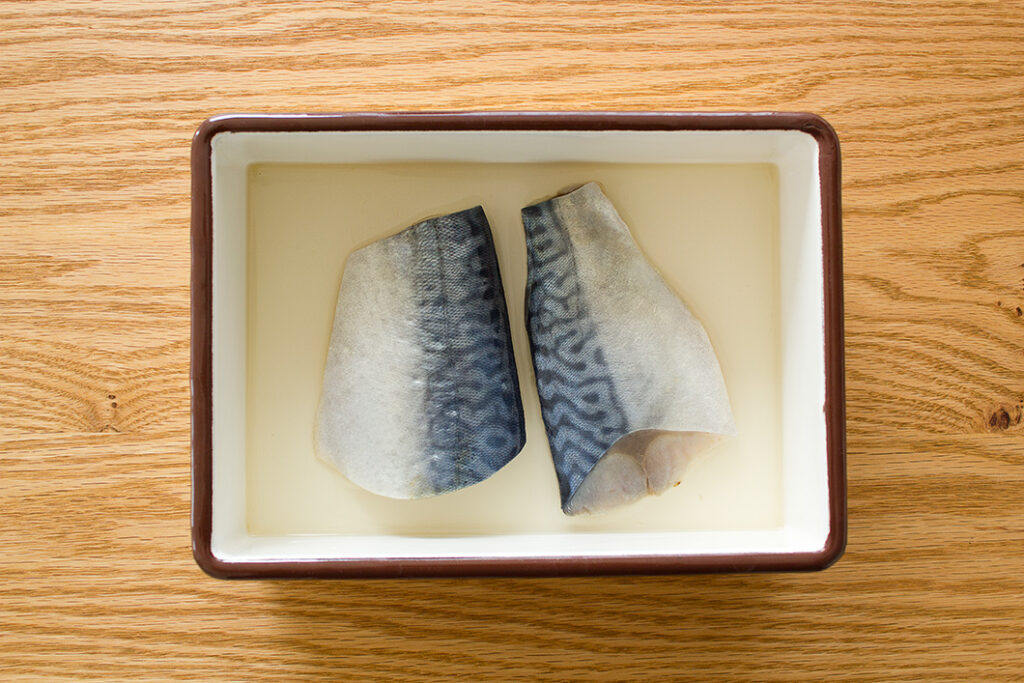 塩鯖は腹骨・中骨を削ぎ取り、ひれ・小骨を丁寧に除く。小ぶりの容器に鯖と米酢(鯖がひたひたに浸かる程度)を入れる。ラップで表面をぴっちり覆い、冷蔵庫で約3時間おく。