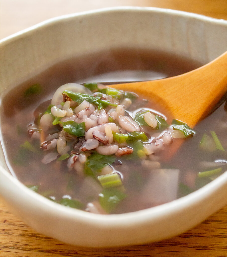七草粥の代わりに、体に優しいスープ仕立てにしました。あっさりしているのにコクがあって、とても美味しいスープです。鶏肉はサラダやラーメンのトッピングにもおすすめです。お試しください!