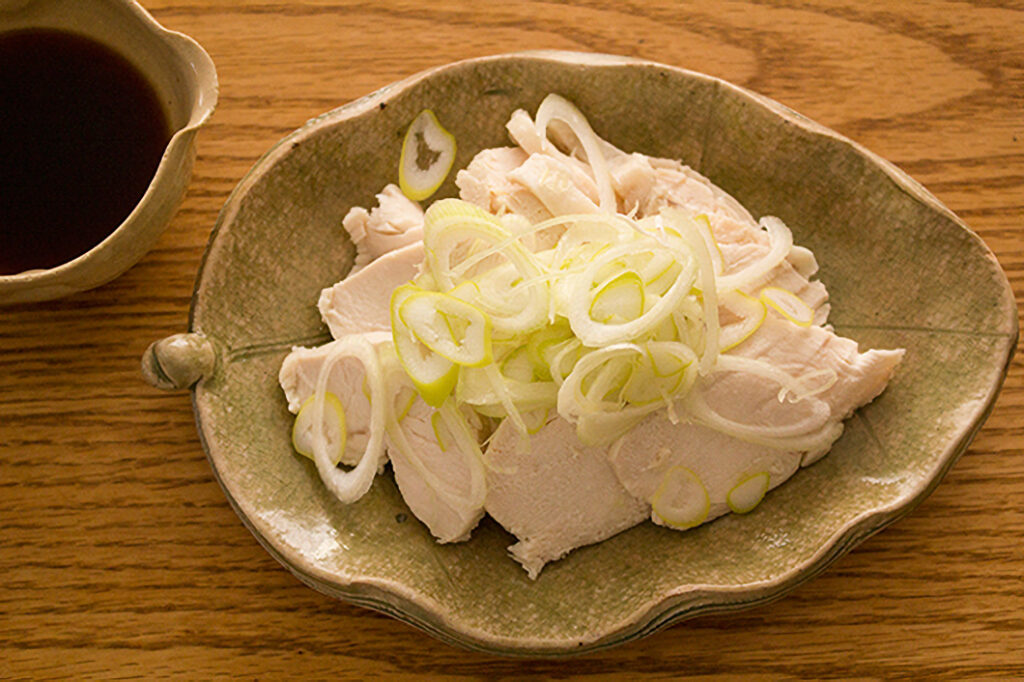 ※鶏だしをとった鶏肉はサラダチキンとして、おかずに。薄切りにしてネギなどを添え、お好みのタレでどうぞ。