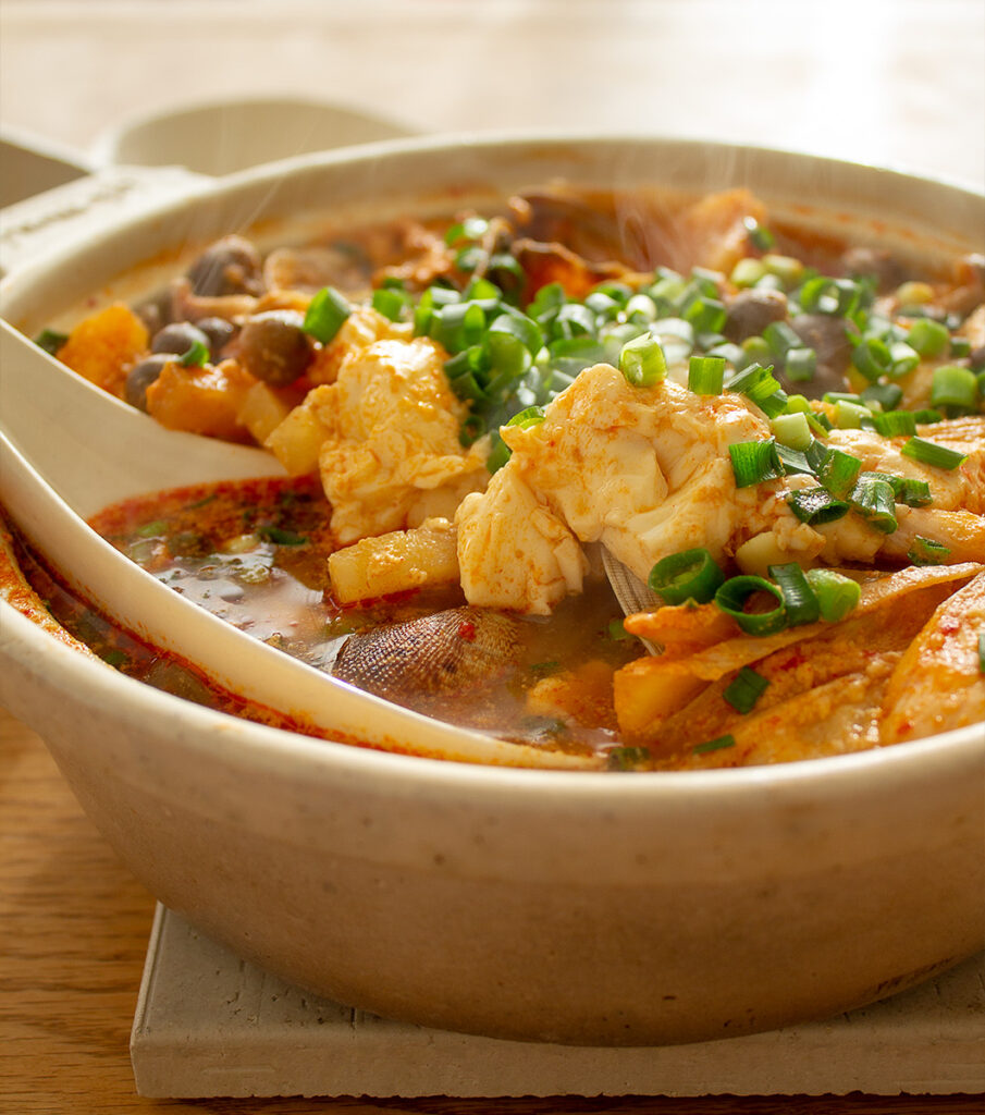 キムチとコチュジャンの量はお好みで加減してください。今回はキッチンで作ってアツアツを食卓に運びましたが、卓上コンロを用意して、肉やあさりを足しながら卓上の鍋物として楽しむのもおすすめです。
