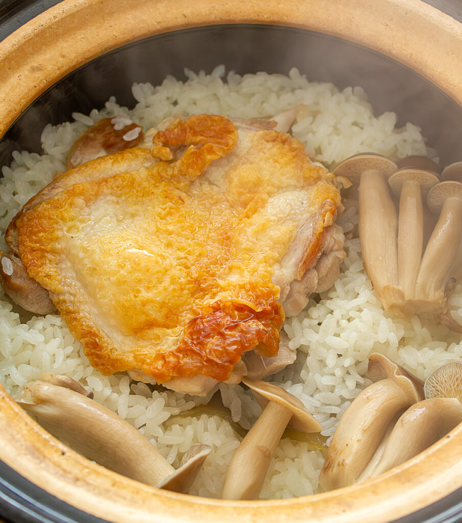 こんがり焼いた鶏肉をそのまま米の上に乗せて炊き上げ、バターで仕上げる炊き込みごはんです。