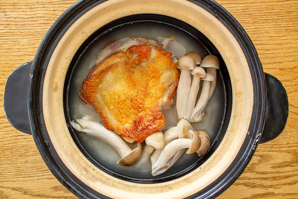 洗ってしっかり水気をきった米・分量の水・だし昆布を「かまどさん」に入れ、20分浸水する。鶏肉は両面に塩(分量外)を適量ふりかけて10分おき、フライパンなどで皮目をじっくりこんがり焼く(裏面は焼かなくてOK)。肉から出た脂はキッチンペーパーで吸って除く。しめじは根本を落とし、小房に分ける。