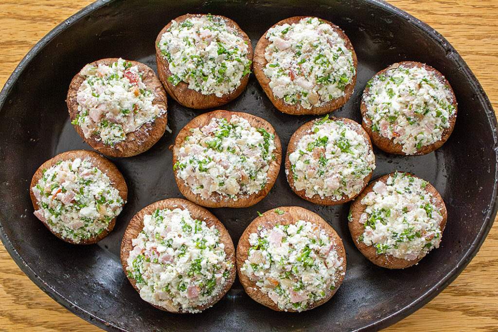 しいたけの軸・カッテージチーズ・ベーコン・パセリ・にんにく・オリーブオイル・塩をよく混ぜ、しいたけの傘に詰める。