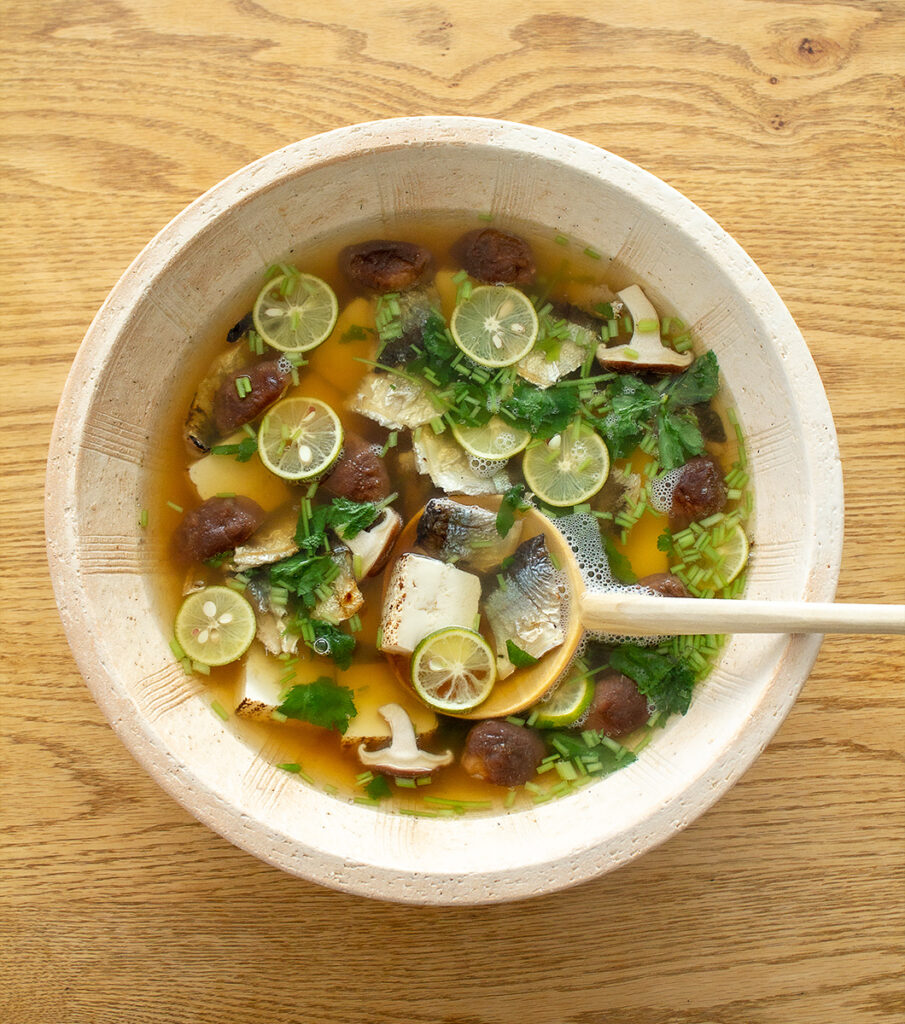 土鍋に【A】と(1)のさんまの中骨を入れ、ふたをして中火にかける。沸騰したら火を止めてそのまま20分余熱調理し、しょうが・昆布・骨を取り除く(浮いている焦げなどもきれいに除く)。しょうゆを加えて味をととのえる。