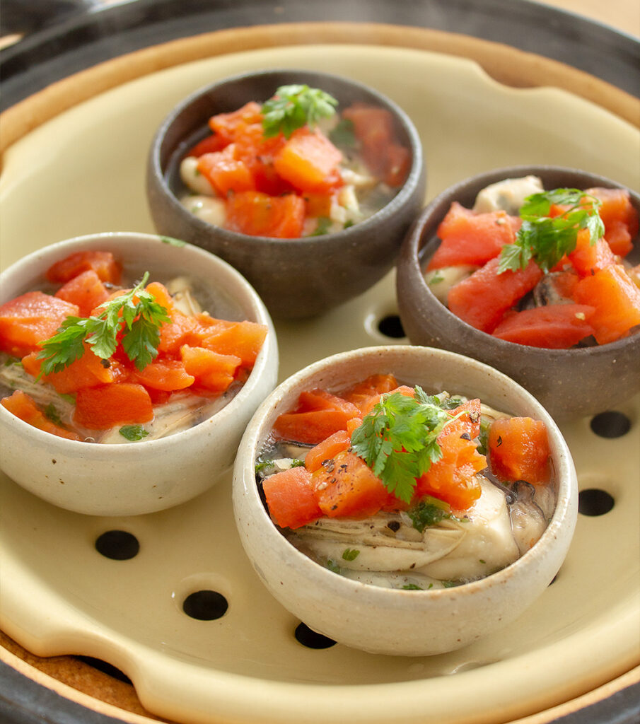ひとり分ずつ器に入れて蒸す、牡蠣を使った一品です。おもてなしの一品やおつまみにどうぞ。
