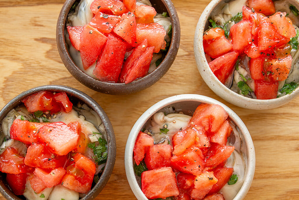牡蠣はさっと洗い、水気をきる。マッシュルームは十字に包丁を入れ、4等分に切る。ハーブは葉を一部飾り用に残してざく切りにする。トマトは湯むきし、角切りにする。