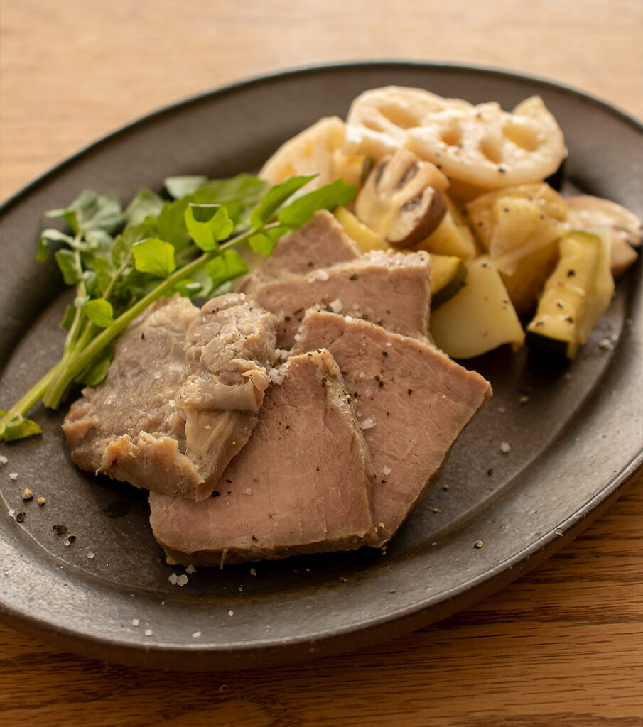 肉を温め直して切り分け、マリネ野菜とともに盛り付ける。お好みで塩・こしょう(分量外)をつけていただく。