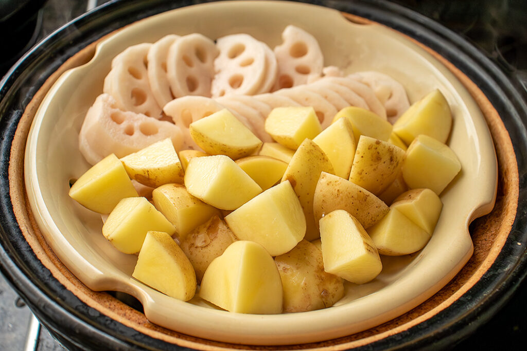 野菜を蒸し終わったら陶製すのこをはずしてふたをして、引き続き弱火で20分煮込む。火を止めてそのまま完全に冷まし、余熱調理する。