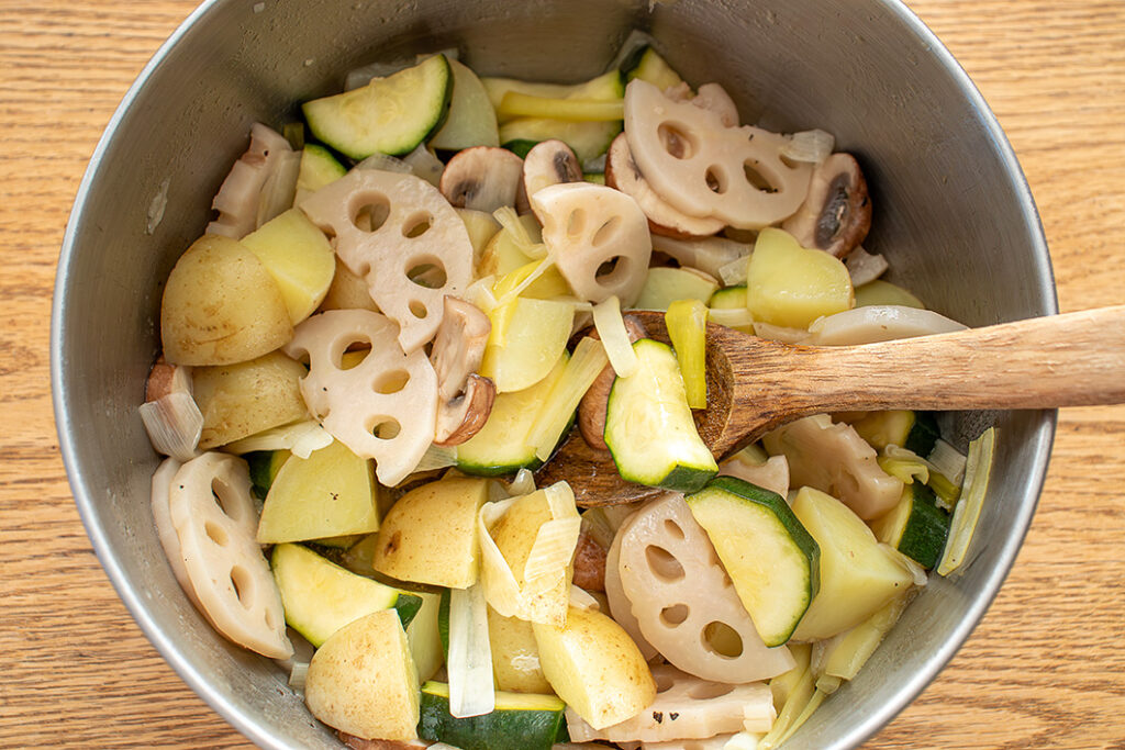 それぞれ5〜10分程度蒸し(じゃがいもとレンコンは長めに蒸す)、蒸し上がったところから[B]のボウルに入れて全体をよく和え、保存容器に移す。