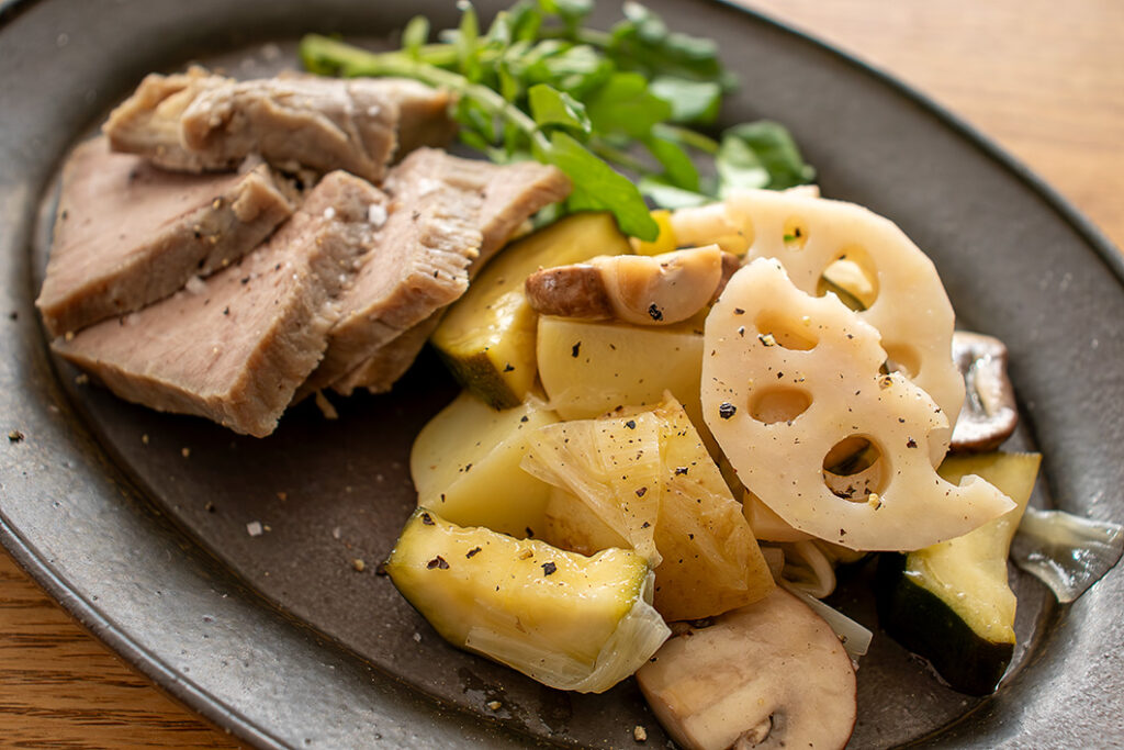 (2)豚肉を煮る蒸気で野菜を蒸す〜野菜をマリネする