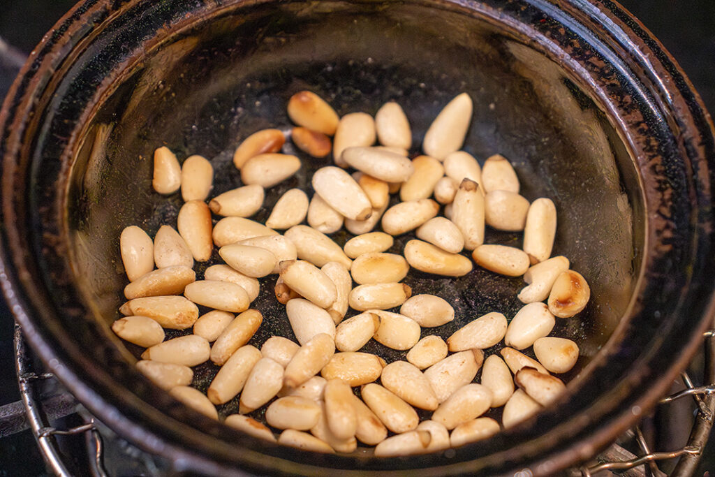 バジルソースは使い切る量なら、すり鉢で作るのがおすすめです。松の実は「エッグベーカー」で炒りました。今回のレシピのように少量の実やゴマを炒るのに便利です(空焚き可能な土鍋ならどれでも代用できます)。