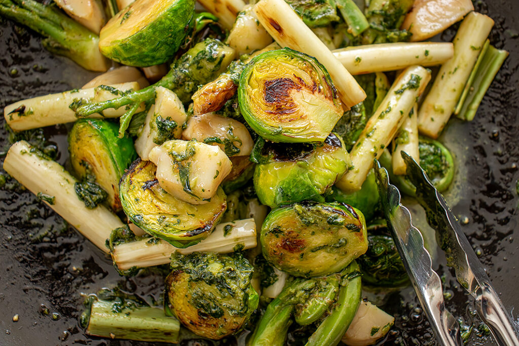 たっぷりの山菜を陶板鍋「ふっくらさん」でグリルにしました。バジルソースも美味しいのでぜひ作ってみてください。