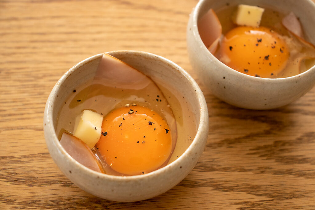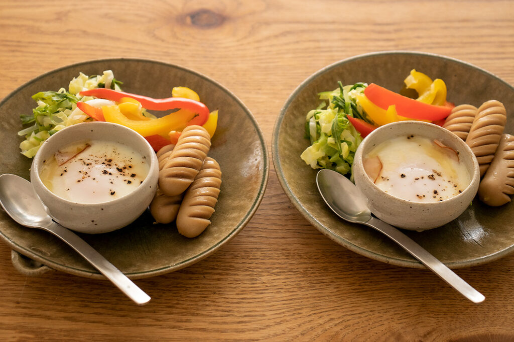 キャベツは千切りに、水菜はざく切りにして合わせて混ぜておく。パプリカは食べやすい大きさに切る。ウインナーは切り込みを入れる。ハムは半分に切って耐熱の器に敷き、上に卵を割り入れる。卵にバターをのせ、塩・こしょうする。