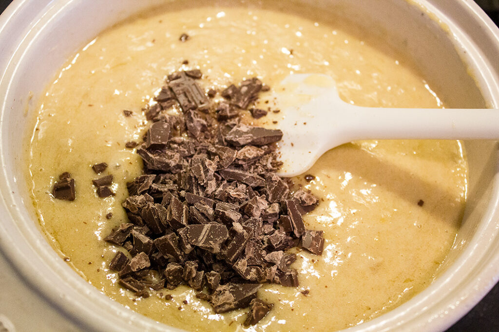 (3)に(2)・砕いたチョコを加え、全体が均一になるように混ぜる。最後に表面をならし、輪切りのバナナをのせる。