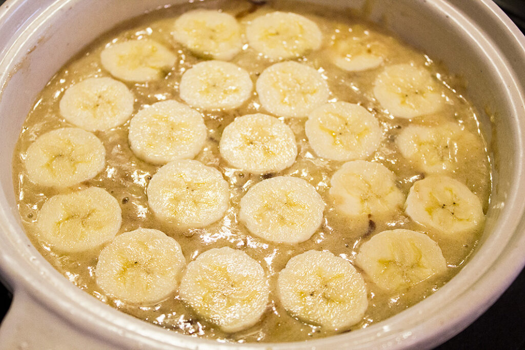 「ビストロ土鍋」にバターを入れて中火にかけ、細かい泡が立つまで加熱して火を止める。余熱で茶色く色づくまで焦げたら潰したバナナを加え、さっと混ぜる。