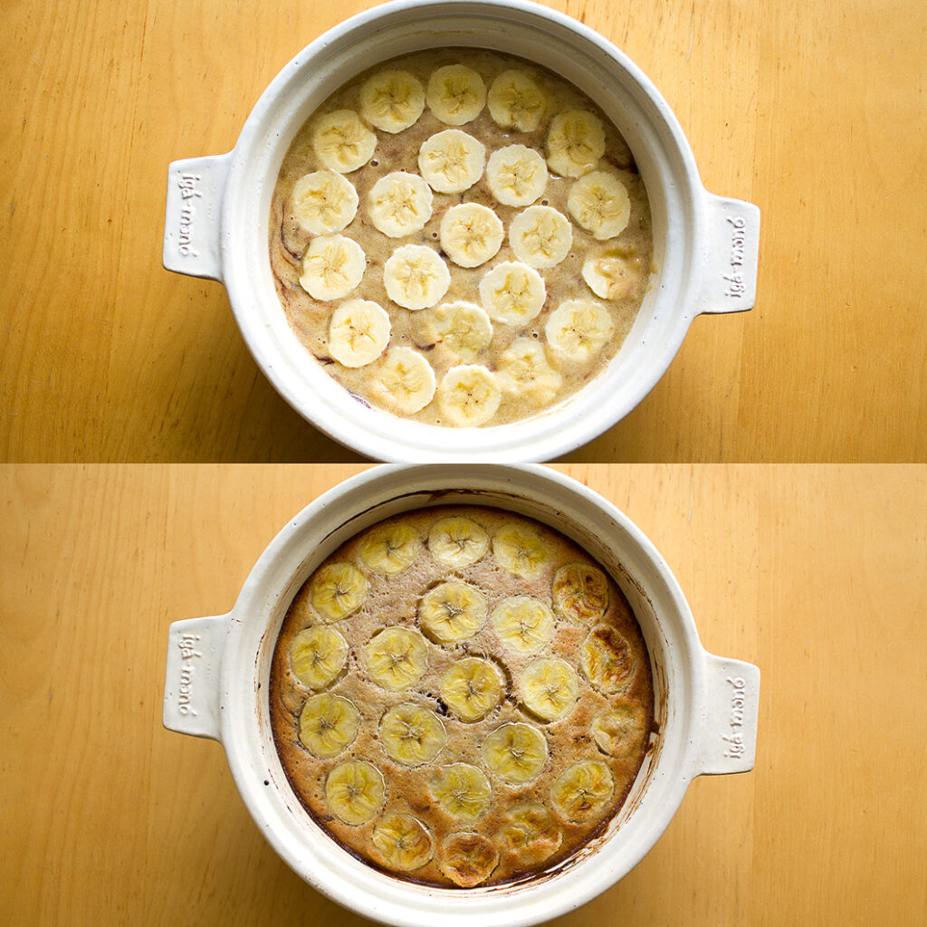 200℃に予熱したオーブンで約30分焼き(ふたはしません)、串などを刺して生地がついてこなければオーブンから取り出す。あら熱が取れたら清潔な布巾などをはさんでふたをして冷まし、切り分けていただく。
